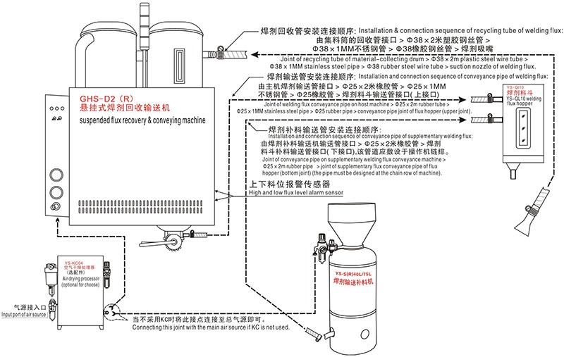 本机专门适用于横臂式焊接操作机。由YS-GHS-D2悬挂式自动焊剂回收输送机和YS-SDR1输送补料机组成自动焊剂回收输送补料系统。本机如在小型焊接操作机无法承受悬挂功能的情况下,可加装落地安装脚组成落地式焊剂回收输送系统,其型号变成YS-HS-D2和YS-SDR1补料机组成。从而满足用户在不同设备上长时间焊接的灵活应用。